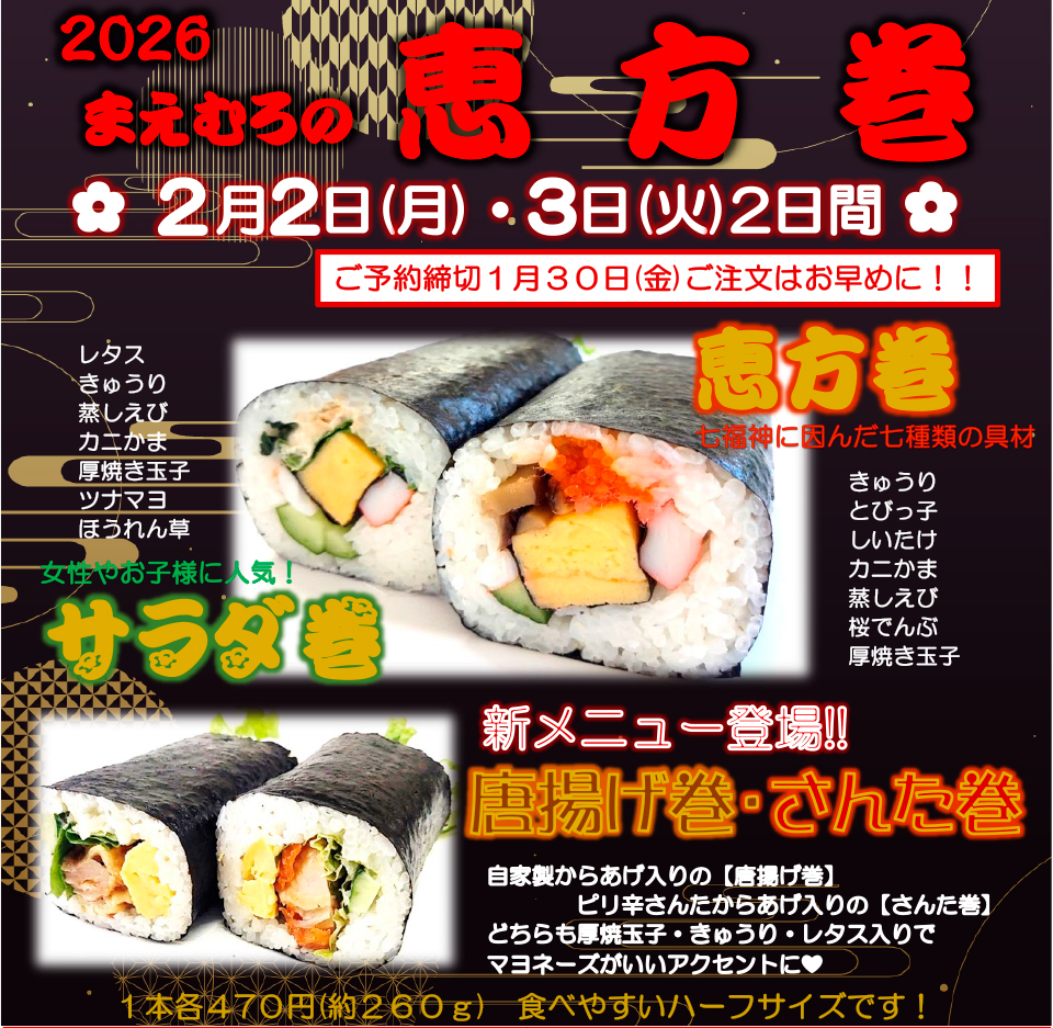 まえむろの「恵方巻」予約受付中。ご予約は、“那須デリバリーフーズまえむろ”で!